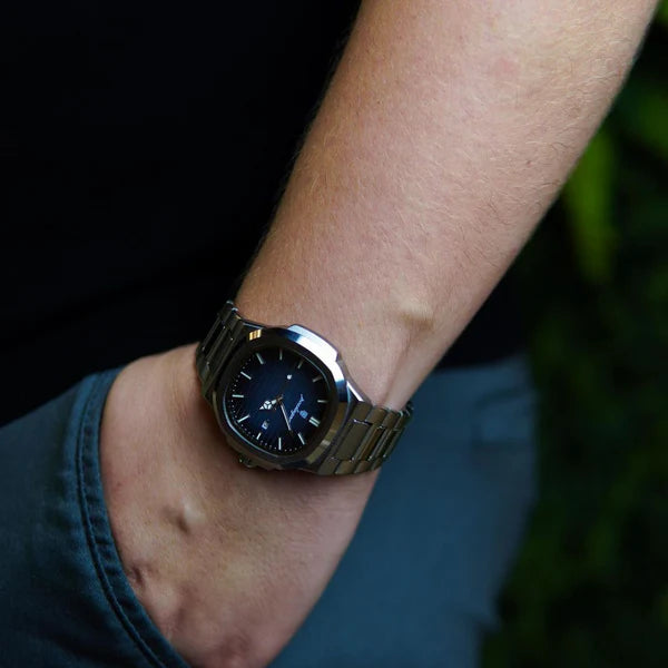 Nuestros relojes están fabricados con acero inoxidable 316L de grado profesional, conocido por su excepcional resistencia, resistencia a la corrosión y brillo duradero. Esto asegura que su reloj mantenga su apariencia impecable a través del uso diario y diversas condiciones.